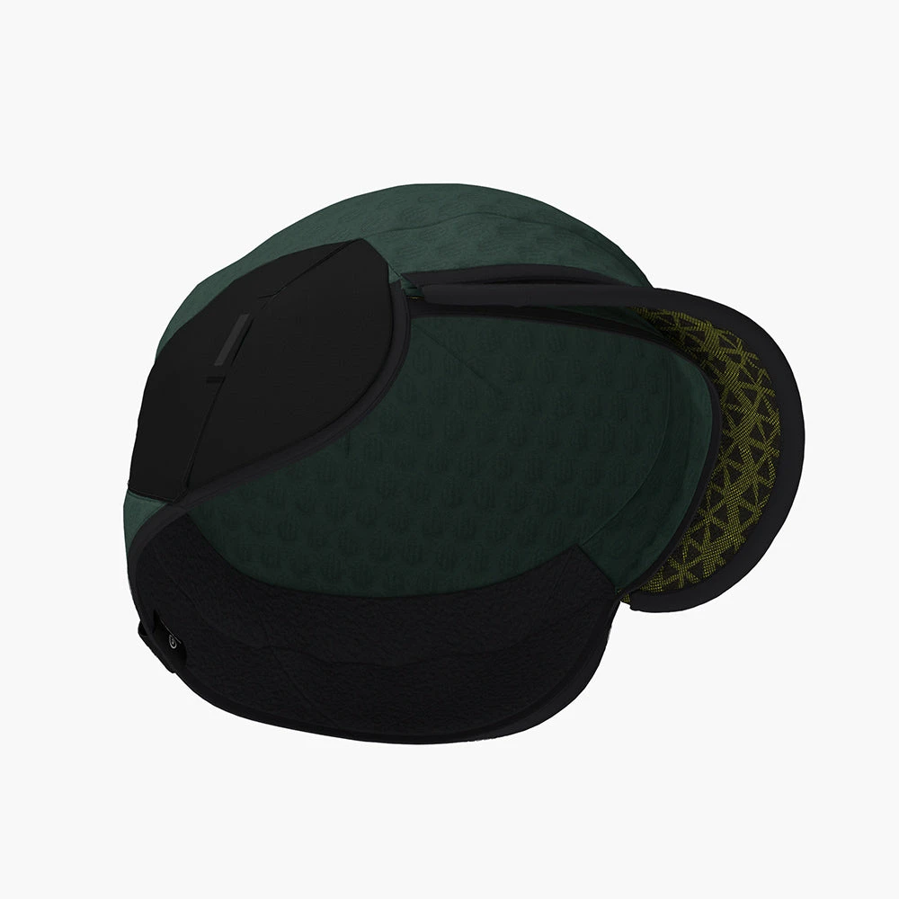 this sits atop a COOLmatic | EXP™ DIAMAfleece, a diamond grid of recycled polyester pile for warmth. Imbedded carbon pushes temperature control to another level. the DIAMAfleece’s construction allows for maximum breathability as well as extra weight reduction. wind resistant fabric covering the ears include chambers, for eyewear placement. the ease of a beanie with the protection of a cap.