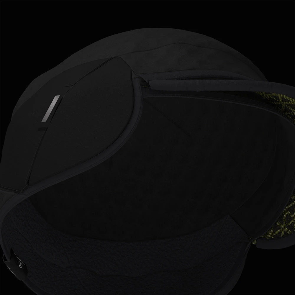 this sits atop a COOLmatic | EXP™ DIAMAfleece, a diamond grid of recycled polyester pile for warmth. Imbedded carbon pushes temperature control to another level. the DIAMAfleece’s construction allows for maximum breathability as well as extra weight reduction. wind resistant fabric covering the ears include chambers, for eyewear placement. the ease of a beanie with the protection of a cap.