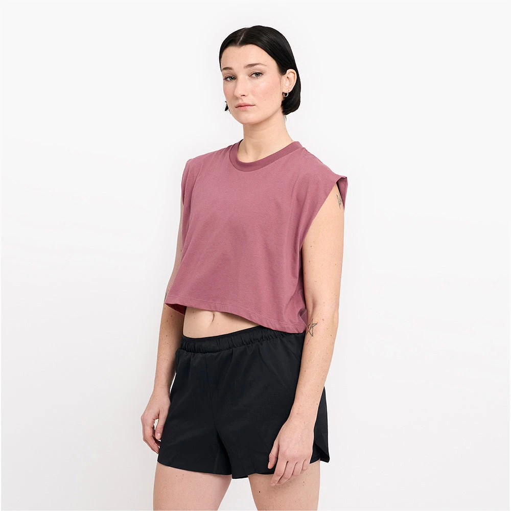 our ORTShirt found love, but also, scissors. we cropped it and cut off the sleeves. we kept it simple and clean (no graphics) and built it in the same midweight recycled cotton we use on our ORTShirt. throw it on over our QCKBra for an early morning easy run.